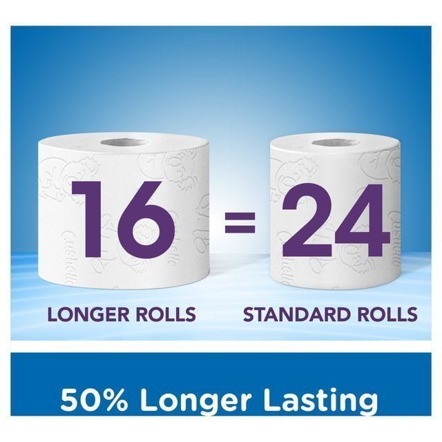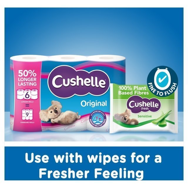 Cushelle Original Toilet Tissue 16 x 50% Longer Lasting Rolls*. Cushelle Original is made with Micro Air pockets that make it ooh sooo soft and highly absorbent for a comfortable clean feeling every time. Now longer rolls. so if it seems like it’s lasting longer. that’s because it is! Use with Cushelle Fresh Toilet Wipes for a fresher. cleaner feeling. *50% Longer Lasting Rolls. compared to standard rolls. 16 Original Toilet Tissue Rolls. 270 sheets per roll