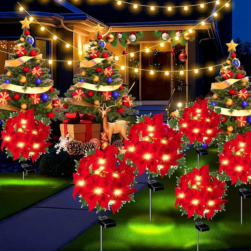 Great holiday Christmas pointsettias solar lights 4 in 1 package red leaves are a velvet material green leafs are a paper like feel to them took 8 days 2 arrive to me